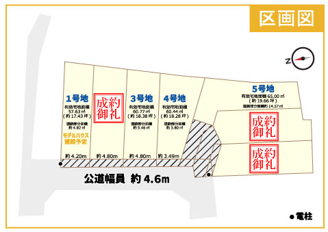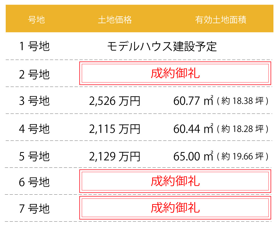 | 販売戸数 / 総戸数 | 3区画/7区画 | 土地面積 | 60.44㎡~65.00㎡ ※別途、道路部分有 |